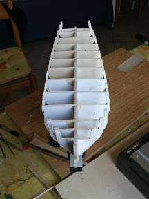 Le ordinate sono state tagliate e sgrossate, nelle foto precedenti sono state messe temporaneamente in posizione per avere finalmente qualcosa che iniziasse ad assomigliare ad uno scafo, o quantomeno ad una carcassa di scafo...