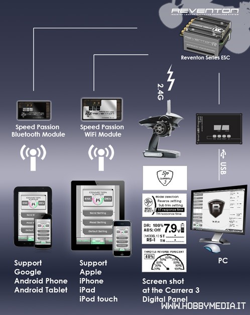 La Speed Passion ha presentato la nuova serie di regolatori di velocità brushless Reventon con connessione wireless che troveremo nei negozi di modellismo il prossimo anno. La novità di questi regolatori è la possibilità di programmazione tramite un modulo Wi-Fi e Bluetooth utilizzando un iPhone, iPod Touch, iPad o smarthphone e tablet con sistema Android. Inoltre sarà possibile regolare l’ESC anche tramite il radiocomando digitale Carries-3 2.4G Pro o la classica card di programmazione con connessione USB per computer con sistemi operativi Windows XP/7.