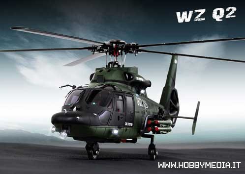 La Walkera ha presentato il nuovo elicottero WZ-Q2 Flybarless con rotore a 5 pale e una fusoliera in stile Eurocopter militare. Fra le caratteristiche principali troviamo un motore brushless da 4000kv per il rotore principale, un secondo motore per il rotore di coda, due ESC, giroscopio a 3 assi e ricevente a sei canali. Il rotore principale è realizzato in metallo e lavorato con macchine CNC con pale dal diametro di 422 mm e 50 mm per la coda. Il carello di atterraggio monta tre ruote e la fusoliera è piena di particolari come la bullonatura delle finte lamiere, missili montati sul lato sinistro e destro e una serie di LED luminosi rossi e bianchi
