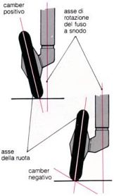 L'inclinazione delle ruota rispetto all'asse verticale è chiamata campanatura o angolo di camber (o più semplicemente camber).Quest'angolo può risultare nullo, positivo o negativo: se la parte superiore della ruota risulta inclinata verso l'esterno, cosicchè le ruote dello stesso assale convergono verso il basso, si parla di angolo di camber positivo; se, invece, le ruote sono inclinate verso l'interno, ossia convergono verso l'alto, l'angolo di camber è considerato negativo.Valori elevati dell'angolo di camber, tanto positivi quanto negativi, sono da evitare perchè tendono a far sollevare parte del battistrada dei pneumatici dalla superficie stradale, con una drastica riduzione dell'aderenza ed un più rapido consumo dei pneumatici stessi: di solito si usano valori che al massimo arrivano a +/- 3° circa (ma solitamente non si usa mai un angolo di campanatura positivo).
