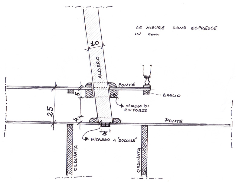Se tu metti un primo rinforzo sotto al ponte principale (un blocchetto di legno che poi andrai a forare) ed uno sul ponte sottostante (altro blocchetto di legno sagomato con la forma tipica a quadrato o losanga dell'epoca), già forato, avrai costruito due "boccole" entro le quali il tuo albero troverà adeguata collocazione.