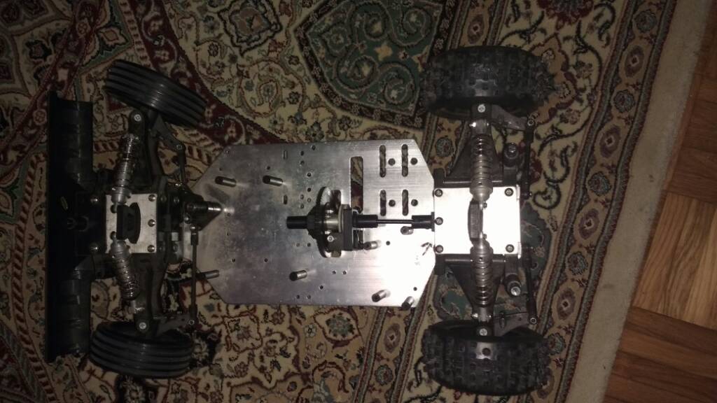 potrebbe essere 4wd, ha il differenziale anteriore, i semiassi? non si capisce dalla foto, si vede che manca il cardano centrale, manca il serbatoio, supporto motore, scatola radio, cage... Ruota storta intendi che curva? si devono regolare i tiranti dello sterzo. Le gomme anteriori sono più da 2wd che non da 4, comunque.