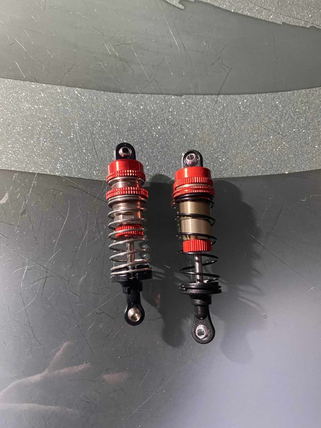 Sul modello sono presenti 4 ammo con corpo in metallo e ghiera di regolazione del precarico Una cosa che mi piace molto visto che tendono a danneggiarsi di meno rispetto a quelli tutti in plastica che possono perdere il tappo superiore a causa degli sforzi Peccato che siano una spudorata copia di quelli della lc racing ( in foto un ammo anteriore della cinesina contro un posteriore della lc )Allegato 395681 Tolta la molla si presenta davanti a noi l’ammo in tutta la sua lucentezza Rimuoviamo la ghiera e si nota che,pur avendo un or di tenuta, si svita/avvita con troppa facilità tanto che mi sembrava non fosse presente nulla per non farla muovere Allegato 395682 Controlliamo anche il livello dell’olio per assicurarci che ne sia presente una buona quantità Allegato 395683 Olio appena appena sotto il livello giusto come si nota dalle bolle d’aria presenti Inoltre si vede l’assurdo sistema per tenere il pistone ( a 4 fori ) cioè un pin che passa nello stelo tenuto fermo da non si sa cosa Inviato con il mio iPhone - Scarica l‘app del Forum di Modellismo.net |