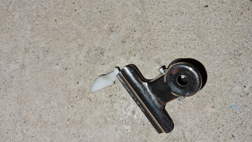Taglio una piccola striscia che posso arrotolare intorno al braccio che saldo introno al braccio usando acetone. Per tenere il braccio e questa striscia bloccati insieme uso una molletta in metallo.