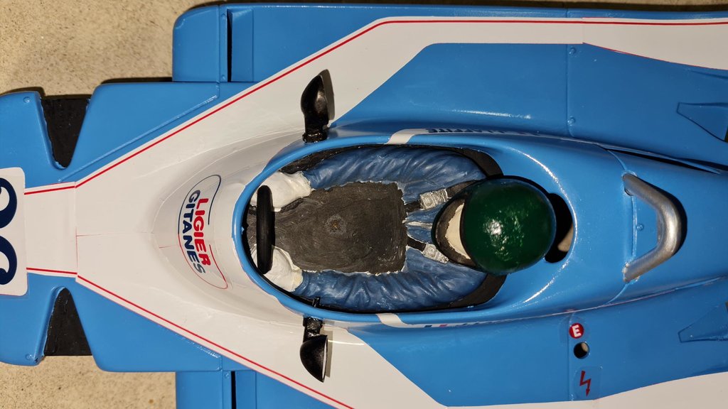- la carrozzeria in stirene è messa molto male. Alettone posteriore è quasi completamente staccato probabilmente a causa di un impatto posteriore non saprò mai se per un errore di guida in retromarcia oppure per un tamponamento. Nel secondo caso sarebbe interessante vedere la macchina che ha tamponato la Ligier...