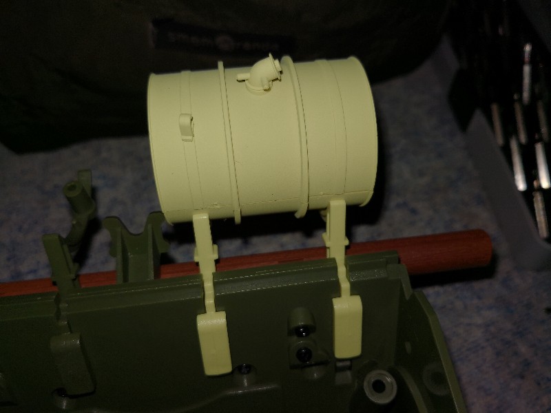 Assembliamo il barile tramite le due viti ed agganciamolo ai supporti gialli montati sullo scafo in precedenza