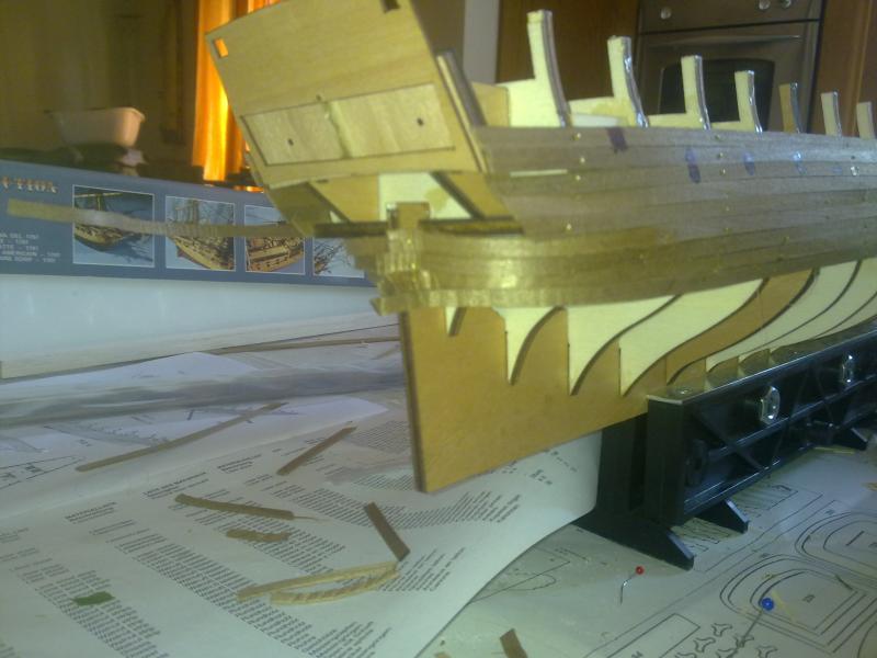 i listelli,dall'incintone più basso in poi,vanno curvati verso l'alto in modo che si inchiodino al dragante...se si tratta di un vascello del XVIII sec. o inglese.