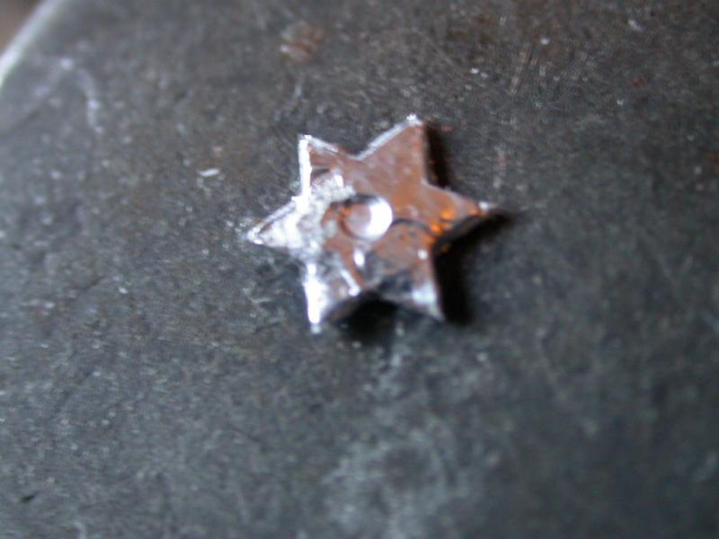 Dopo un paio di tentativi,riesco finalmente a farmi una stella a sei punte,si vede che non mi piace molto,come simbolo.Ma daje e daje,ce la fò,anche perchè doveva comunque avere un 3D.Mi rifinisco un pezzettino a forma vagamente di "otto",una volta che ci incollerò sopra la stella,ed avrò uniformato il tutto di colore metallico,avrò(spero) la parte mancante della forcella,posizionata sul lato dx.Penso sia una regoazione del molleggio,è comunque molto importante,coreograficamente:richiama molto la quasi totalità delle moto che piacciono a me.