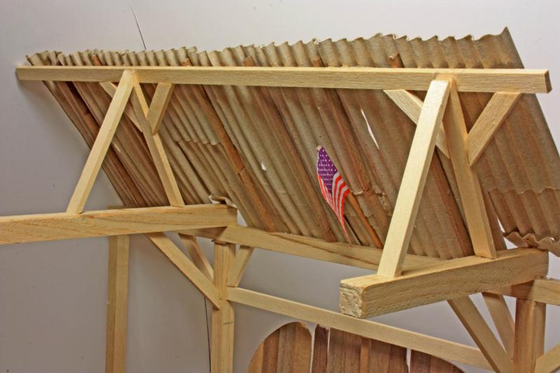 Per il tetto avevo inizialmente pensato al legno ma poi ho optato per una lamiera ondulata (ovviamente da fare tutta rugginolenta) simulata con la parte interna di un cartone da imballo.. è una rottura ottenere il foglio ondulato, ve lo assicuro, ma con un po' di pazienza si può lavorare da entrambi i lati per eliminare la carta in eccesso con cutter e spugnette abrasive..
