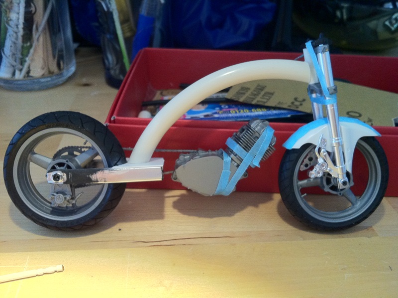Il progetto e` una Mac Motorcycle, usando il motore della Yamaha srx-600 (Tamiya), le ruote e il forcellone anteriore della Yamaha YZF-R1(Tamiya) poi tutto il resto autocostruito!
