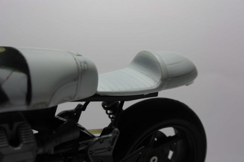 Prendendo ispirazione da qualche cafè sul web, ho anche riprodotto le cuciture orizzontali sulla sella stessa usando la punta di uno spillo montata sul trapanino a mano e un po' di nastro adesivo.