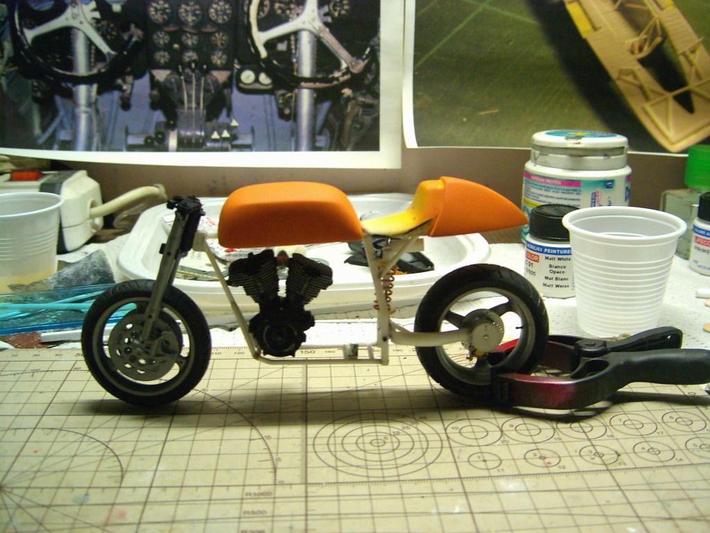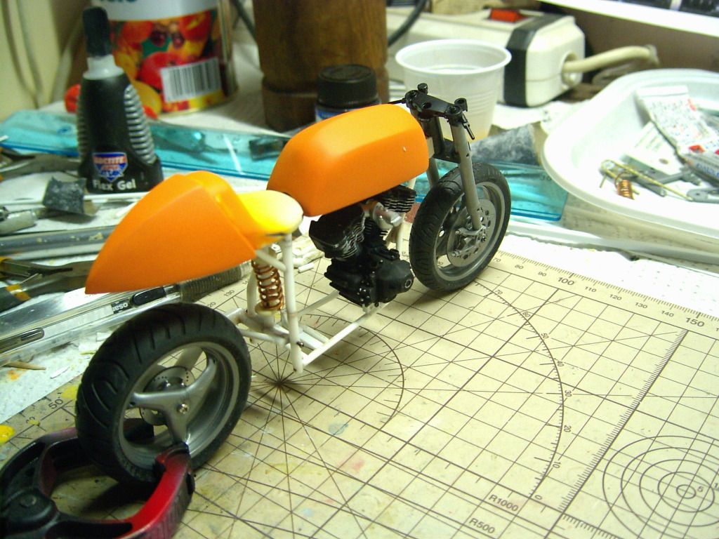 devo dare un'altra mano di arancio a cui penso di applicare una striscia(o due)orizzontale nera che vada dal codone e abbia soluzione di continuità sul serbatoio.poi volevo mettere il tappo serbatoio su un lato superiore invece che centrale.vediamo.