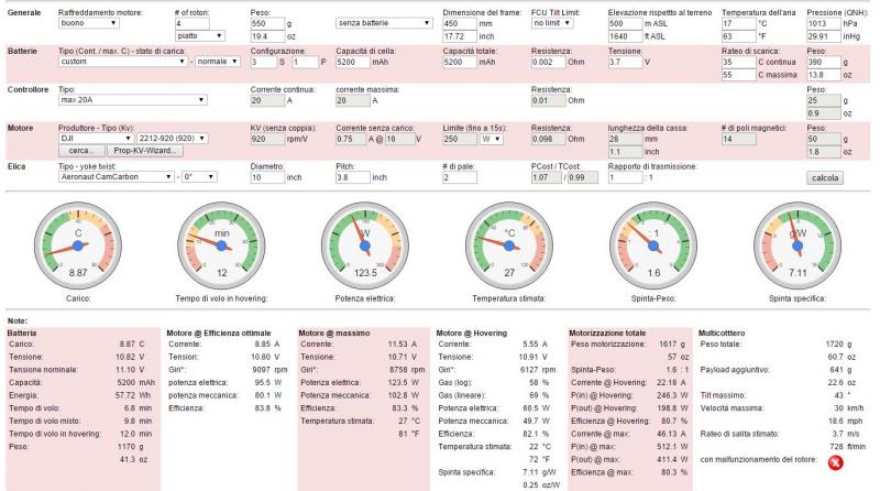 ho provato qualche configurazione e con eCalc.ch non mi da piu di 12 minuti di volo in hovering (considerando come pesi gimbal e go pro o simile) sembra alquanto poco...