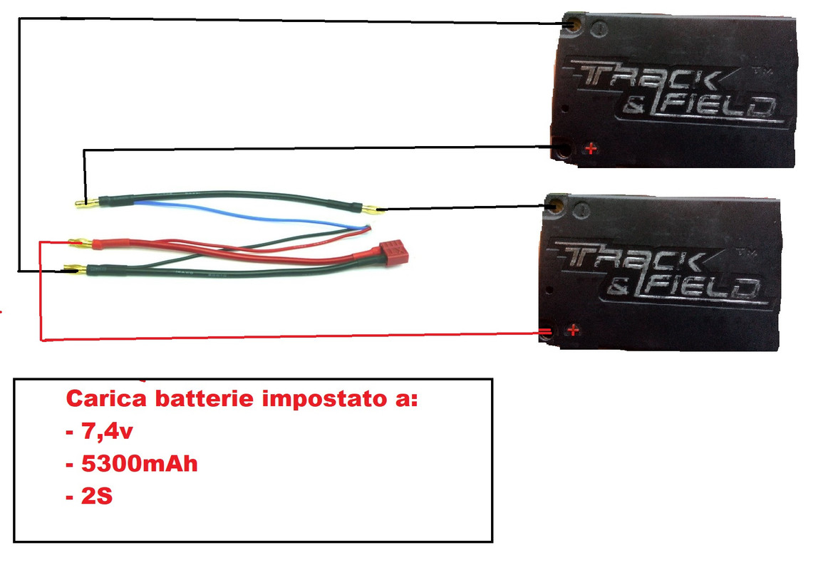 Per l'utilizzo sul modello farei un collegamento in parallelo in modo da avere 7,4 volt e 10600 mAh.