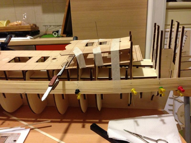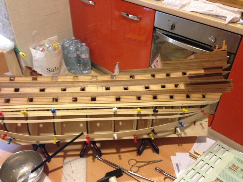 a partire dai sabordi tutti uguali, i calibri dei cannoni, gli affusti (che tu chiami carrellini) non sono certo attinenti all'epoca, le canne, il tavolato dei ponti (come già osservato da Alex),e poi il primo fasciame , la regola sarebbe di farlo tutto , levigarlo per bene , dargli la forma giusta ecc ecc..