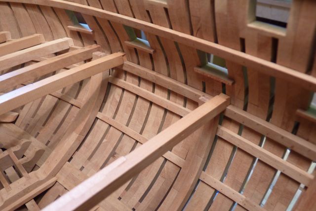 I primi 4 bagli a prua, sono in un solo pezzo, dato che sono più corti degli altri composti in due pezzi, ma vi erano anche bagli di tre pezzi, il tutto dipendeva anche dall'approvvigionamento del legname
