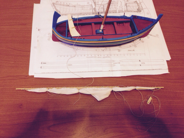 Il cantiere continua con la cucitura a mano della vela che ho deciso di imbrogliarla mentre mi riprometto di costruire un altra tartana questa volta con la vela Latina al vento. Ho dato una mano di flatting trasparente opaco e mi accingo a costruire il timone.
