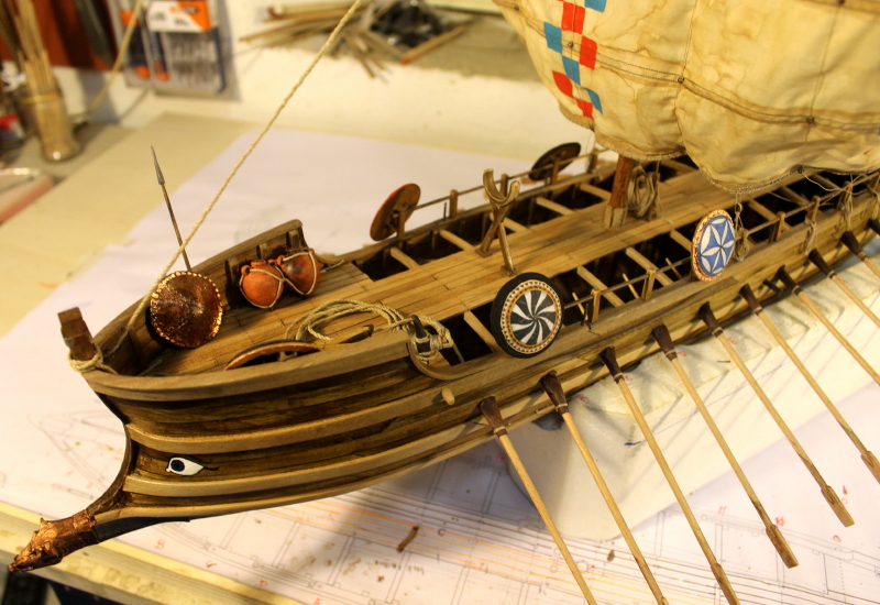 per adesso sono semplicemente "appoggiati" con il bracciale sul montante della balaustra, eventualmente fare una staffa con il filo di rame che passa sia dalla maniglia al bracciale per formare una staffa con gancio per fermarli sulla balaustra (in po' piu' bassi di come sono adesso) venivano posati cosi, sia in parata e a difesa dei rematori. a presto |
