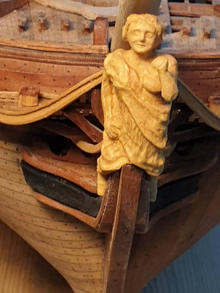 Varie fasi della preparazione della polena.A differenza della nave costruita a Rochefort dai francesi questo modello invece del leone rampante presenta una polena che rappresenta hermione figlia di Elena e di MenelaoAllegato 347917