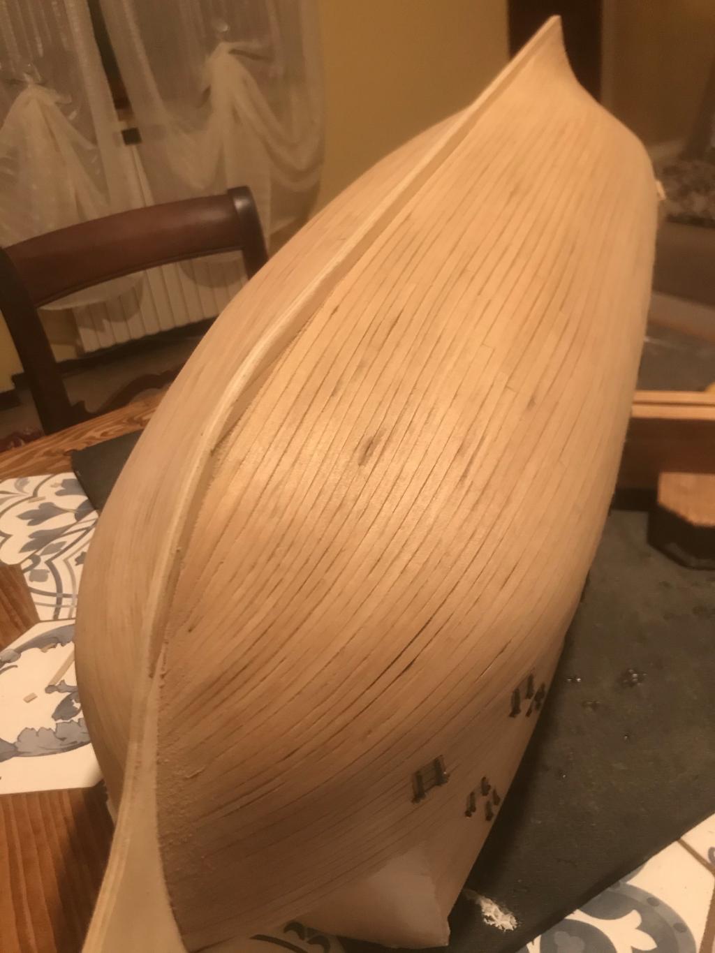 Purtroppo il secondo fasciame, ad un certo punto non seguirà il primo che per comodità è posato a punta...con il secondo sto rastremando man mano prendendo le misure in modo da poter finire, spero, con un listello dritto. Chi crede che il secondo fasciame si posi per via dello spessore ridotto, piu facilmente, e piu rapidamente, è fuori strada.