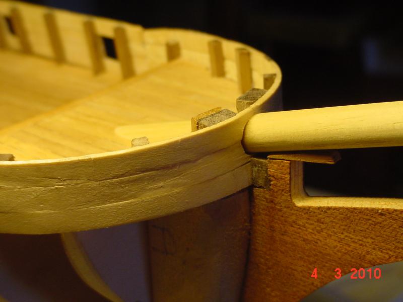 spero che il tuo concorso sia andato bene! Grazie per il tuo intervento. Si, hai ragione la prua sembra troppo appuntita come da foto allegata, pensavo di correggere l'aspetto estetico con la posa del Capo di banda ma il problema penso sia diverso e cioè che dovrò arretrare la posizione dello scalmotto di prua dove appoggiano i corsi del Castello. Però si pone un altro problema del quale mi sono reso conto guardando le tue foto: il bompresso è passante proprio sulla prua per andare ad appoggiarsi sul tavolato del Castello... ma come faccio a montare il o ( gli scalmotti di prua) se deve passare l'albero ? ; dai piani Corel sembrava che il bompresso fosse appoggiato sul dente esterno della chiglia e legato all'appandecice sulla quale andrà la polena, meno male che sei arrivato tu    . Per favore illuminami su quanto esposto, GRAZIE