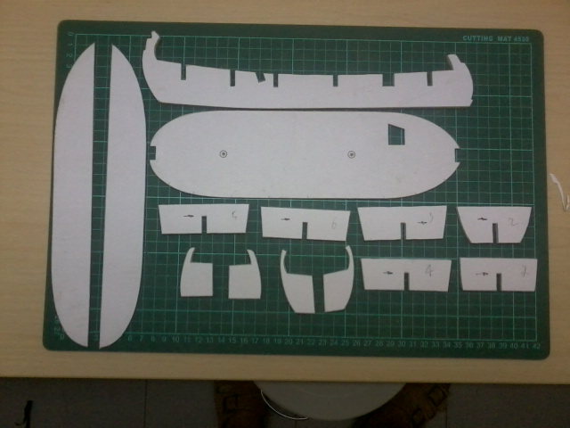 la chiglia l'ho ricavata da due listelli di ayous da 5mm x 30 cm incollati le ordinate con compensato da 4mm il ponte e il fondo dello scafo con compensato da 1,5mm...