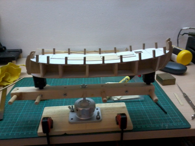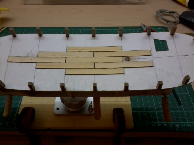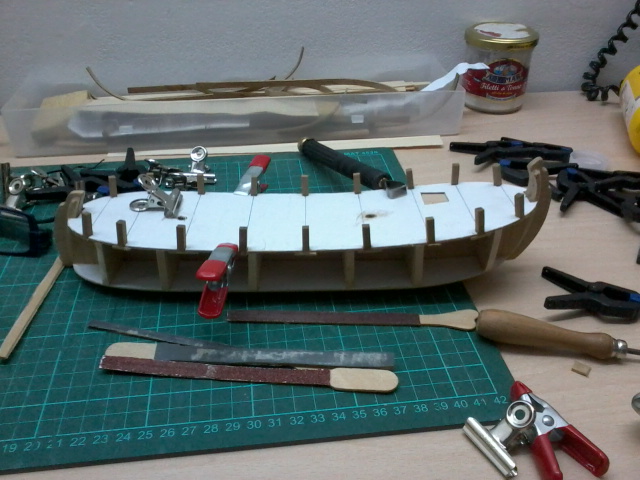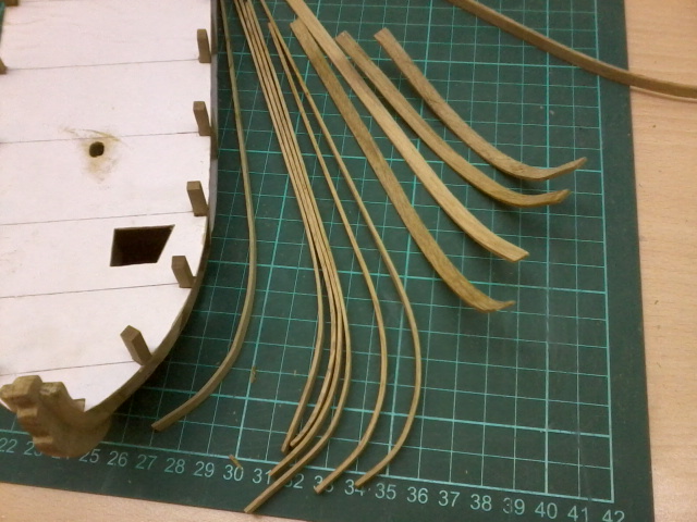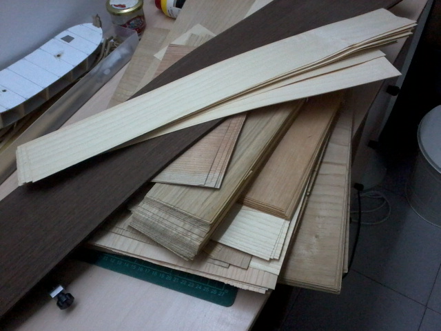 il primo fasciame (e forse unico) l'ho ricavato da un listello di pino tagliato in listelli da mm 1,5 x 10