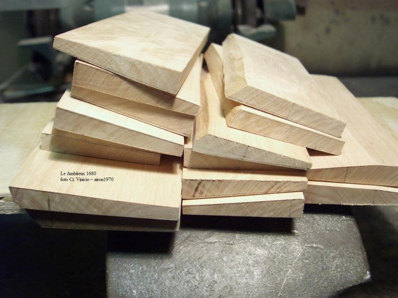 Buonasera a tutti, per la messa in opera degli scalmi di cubìa mi sono costruito uno scaletto appositamente per lavorarci in piena comodità, come del resto ho fatto per la poppa. Ho incollato una fotocopia di una parte del piano di costruzione per avere i punti di riferimento per posizionare ogni singolo scalmo fino al completamento di essi tra la ruota di prua fino al caposesto. prima di tagliare gli scalmi ho rastremato ogni tavoletta per dare già ad ogni elemento la sua inclinazione. Poi ci ho incollato le fotocopie degli scalmi, li ho tagliati e dato ad ognuno di essi la forma interna del quartabuono utilizzando un pezzettino di vetro per rastremare a mò di rasiera. Posto qualche foto del lavoro della preparazione delle tavolette e dei primi sette scalmi in opera.