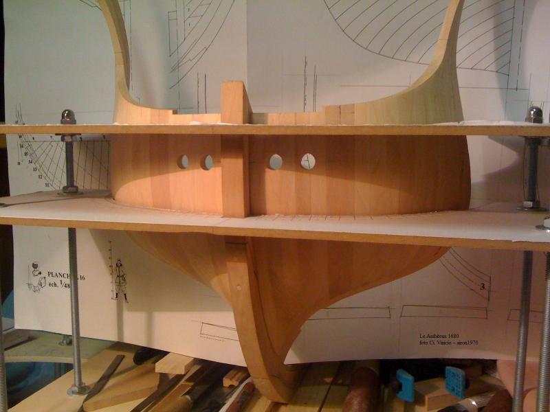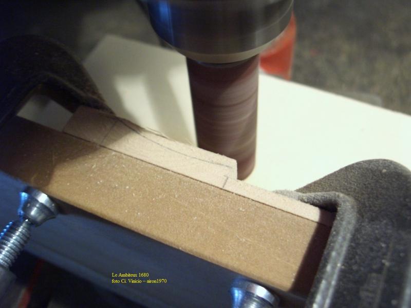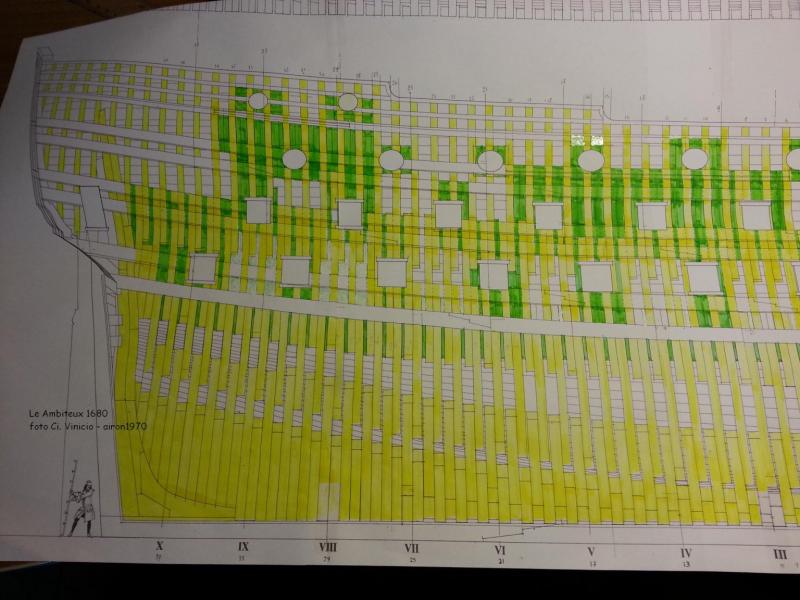 Gli imbuoni in opera, carteggiato tutto lo scafo esterno e iniziato a disegnare le due cinte lato dritta e di sinistra. Prima di procedere alla messa in opera delle cinte, apertura cannoniere e modanature mi sono disegnato il tutto come ben consiglia il grande Frolich, in quanto si possono fare degli aggiustaggi che rendono armonioso il lavoro e poi si procede al lavoro sopra descritto. Il lavoro di carteggiatura all'esterno scafo l'ho eseguito dopo aver incollato tutti gli imbuoni in modo da avere tutto ben pareggiato.