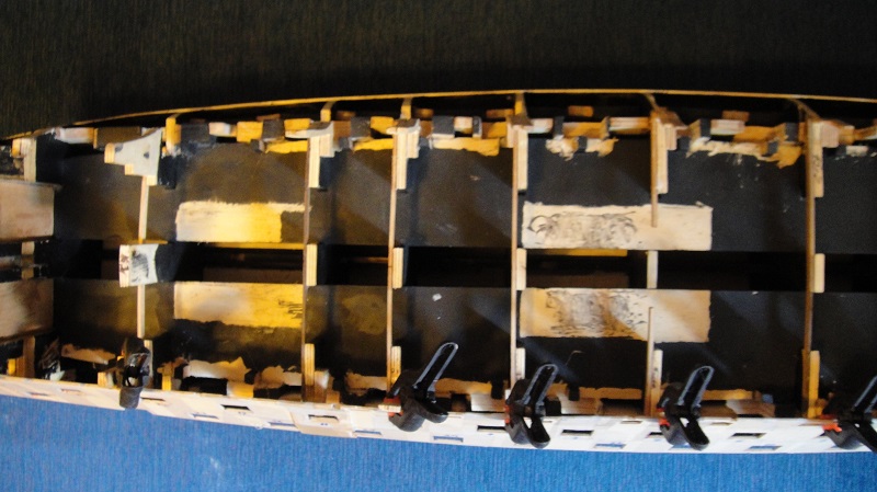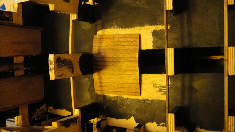 Sono arrivato al 5° listello r il 6° deve passare sotto il ponte di polena. Come è concepita la prua è un disastro. Quindi ho provveduto a imbonirla anche qui!