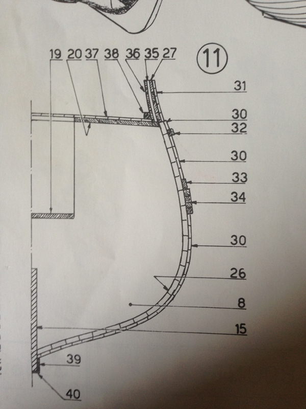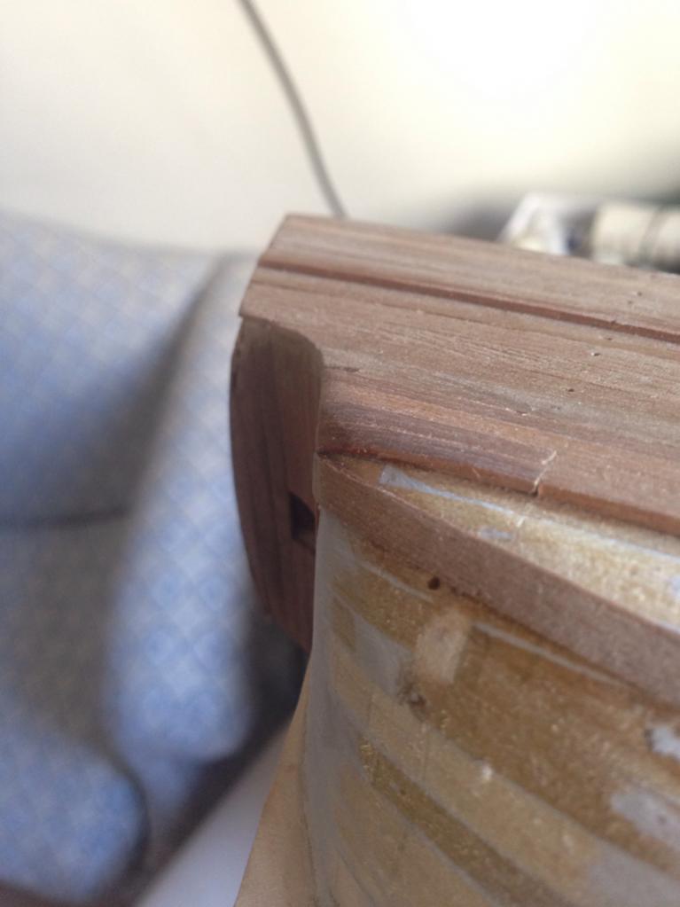 Inoltre sul profilo in sezione riportato nella tavola per i fari strati di fasciame risulterebbe che il listello segnoto come 33 debba essere meno fuoriuscente dei 4 listelli 34, invece a me è l'esatto opposto (non so se si riesce a vedere in foto).