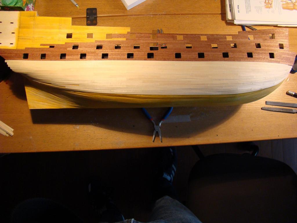Allora per quanto riguarda la disposizione dei sabordi non so rispondervi in maniera precisa. Ho seguito le misure che mi davano le istruzioni e anche sulle foto dei fascicoli si vede la terza fila che non è esattamente uguale alla prima. Come dice Dekko questa cosa può avere un senso in funzione delle sartie degli alberi. Vedrò col proseguimento dei lavori come si svilupperà il modello. Chi vivrà vedrà