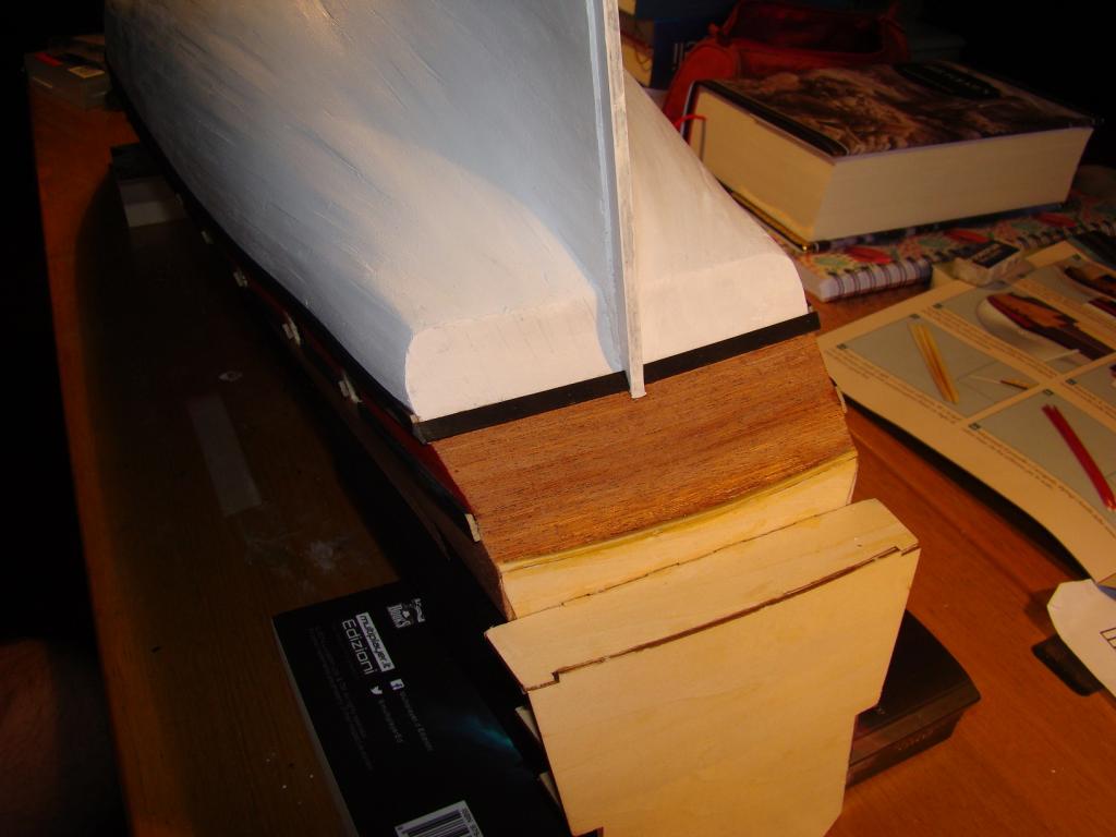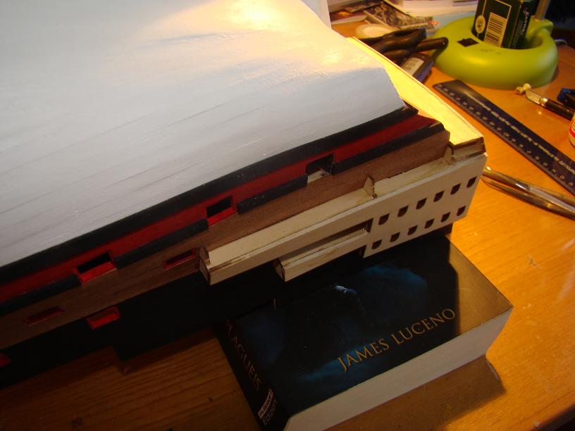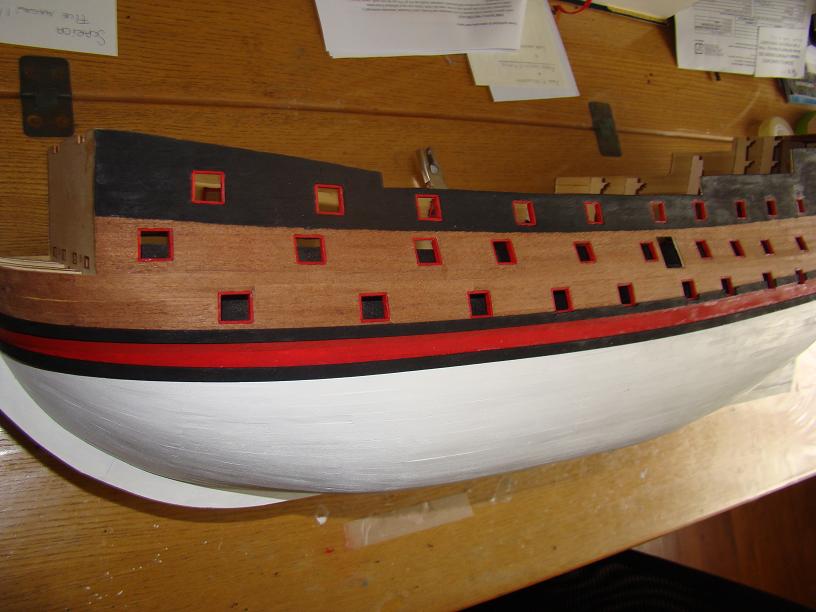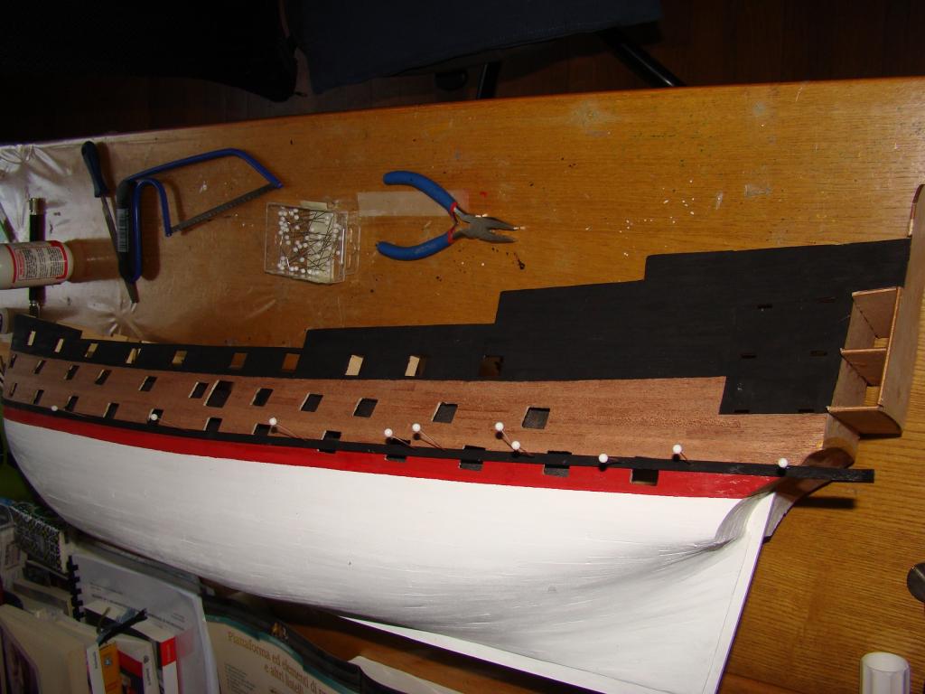 Ho preso i listelli di tiglio di 1.5x5 forniti nell’uscita 39 che mi serono per fare gli incintoni (foto 1). A questo punto però mi son reso conto di una cosa e cioè che gli incintoni non sono altro che listelli che corrono sulla fiancata da prua a poppa e realizzare ogni incintone con 3 spezzoni da 30cm non mi piaceva molto proprio perché avevo paura che mi togliesse regolarità all’andamento dell’incintone stesso sulla fiancata. Ho controllato tra i miei listelli avanzati e ne ho trovati alcuni della misura giusta e lunghi 1 metro. Usando questi listelli posso realizzare gli incintoni nel migliore dei modi e con un procedimento che mi da più fiducia. Quindi ho preso questi listelli lunghi e li ho colorati di nero (foto 2) e una volta che la vernice si è seccata ho iniziato ad incollarli alle murate usando colla vinilica e spilloni (foto 3). Prima ho incollato gli incintoni alti, nella zona di confine tra il rosso e il color sapelli. Ho tolto poi gli spilloni e ho limato l’incintone nella parte di poppa in modo da renderlo pari col fasciame (foto 4). Successivamente ho tagliato l’incintone dove questo mi passava sulle aperture per i cannoni. Per fare questo ho prima bucato l’incintone col trapano in corrispondenza del taglio che dovevo fare (foto 5), poi ho tolto via il pezzetto che copriva l’apertura (foto 6) e poi con una lima l’ho limato in modo da renderlo pari al bordo dell’apertura (foto 7). Con lo stesso procedimento adottato per l’incintone più alto ho incollato anche quello più basso (foto 8 e 9). Poi ho preso dei pezzi sempre dello stesso listello usato per gli incintoni e li ho incollati nella parte di poppa (foto 10) e a colla asciugata sono andato a limarli per pareggiarli allo stesso livello dell’incintone sulla fiancata (foto 11). L’ultima cosa fatta è stata quella di andare a ritoccare il nero sugli incintoni nei punti dove avevo scartato, per esempio in corrispondenza delle finestrature e il rosso che in alcuni punti mi si era un po’ rovinato.