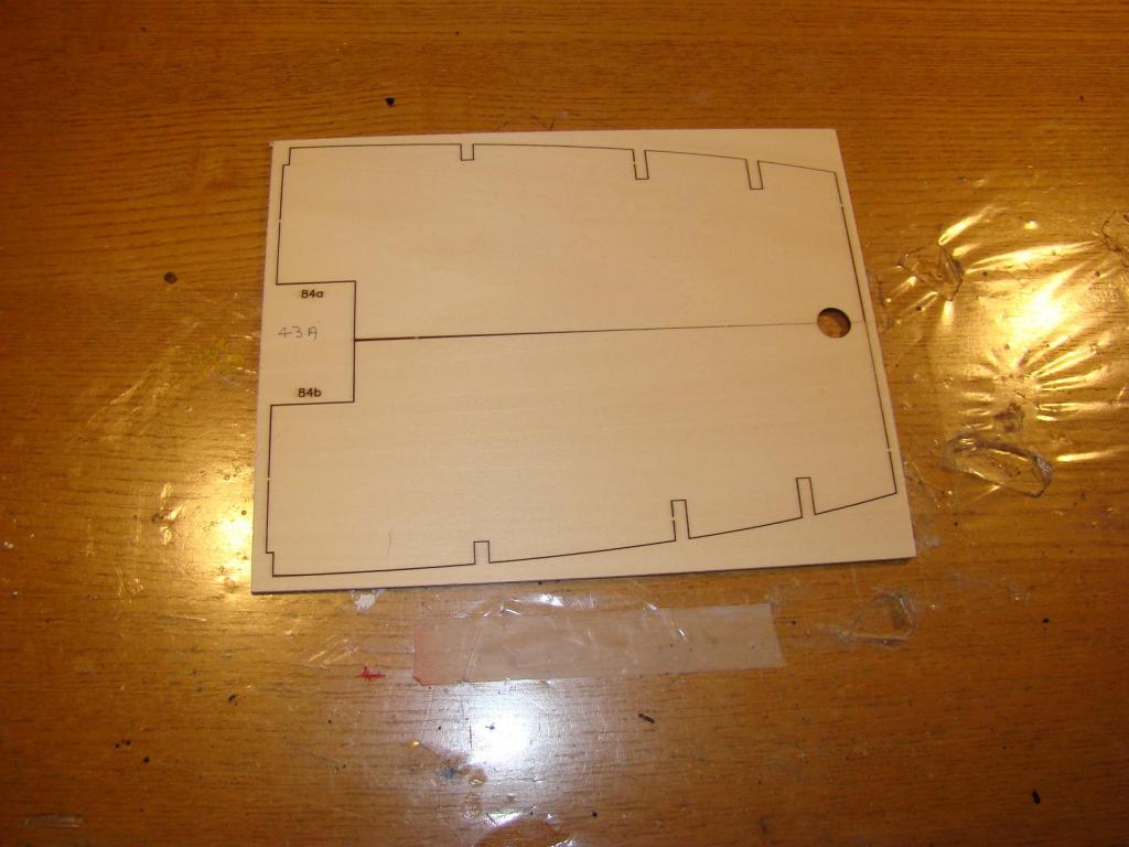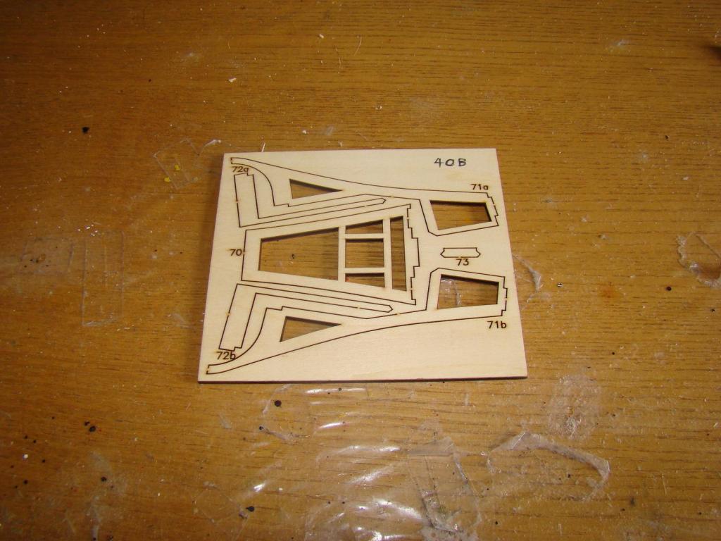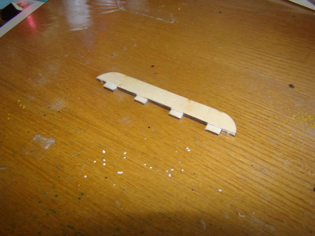 Ho preso la fustella contenuta nel fascicolo 43 (foto 2) e ho utilizzato questi pezzi, opportunamente tagliati, per realizzare i bagli (foto 3). Sempre dall'uscita 43 ho preso i listelli di betulla (foto 4) che ho tagliato e incollato con colla vinilica al di sopra di quelli già presenti tra le ordinate nella metà di prua dello scafo (foto 5 e 6). Acuni di questi pezzi di betulla sono stati limati nella parte superiore in modo da non essere di intralcio per l'incollaggio del ponte superiore. Quando poi la colla si è asciugata ho passato una mano di nero su questi supporti (foto 7).