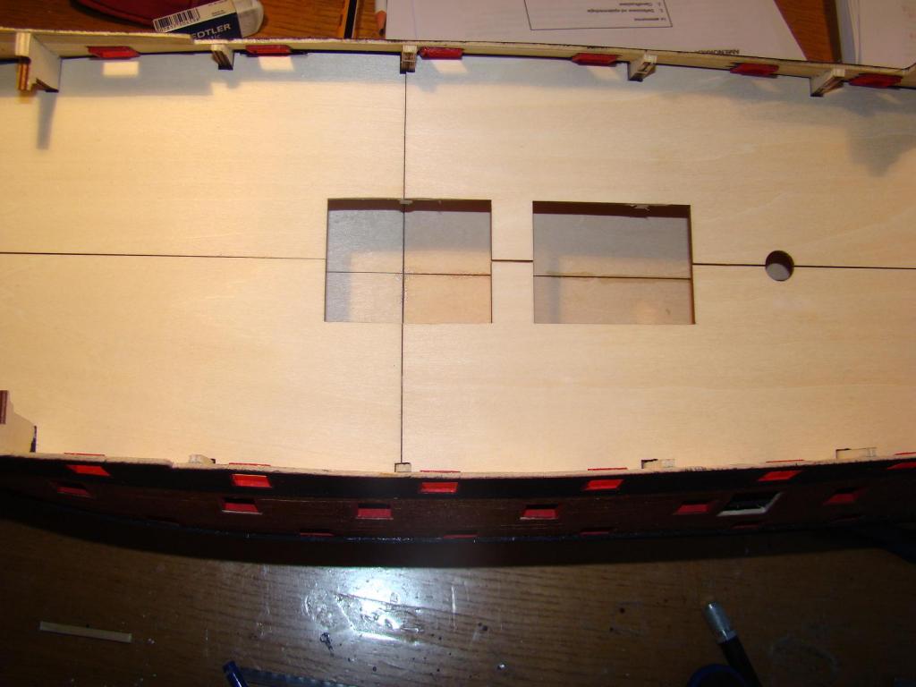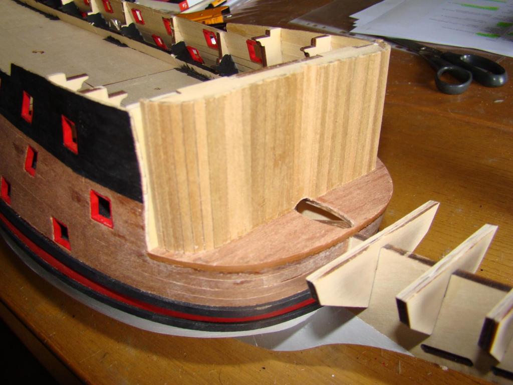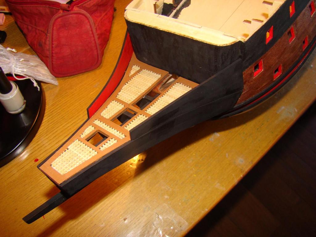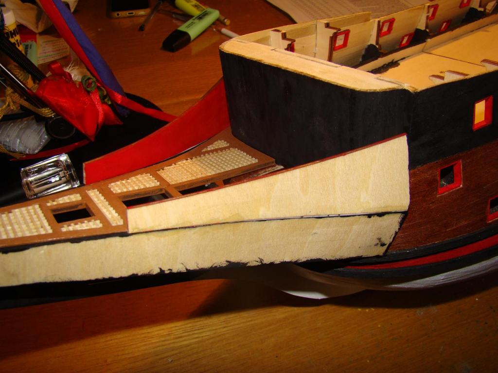 Puoi ancora farlo; in rosso puoi mettere dei gradini, perché la piattaforma di serpe è più bassa del ponte dei cannoni; in blu metti un sostegno che reggerà il putto sul leone; in bianco fora per il passaggio del bompresso. Nella stampa dell' epoca si vede bene la scaletta che dalla porta mette sulla serpe (in rosso) e che il bompresso è laterale alla scaletta (in blu)
