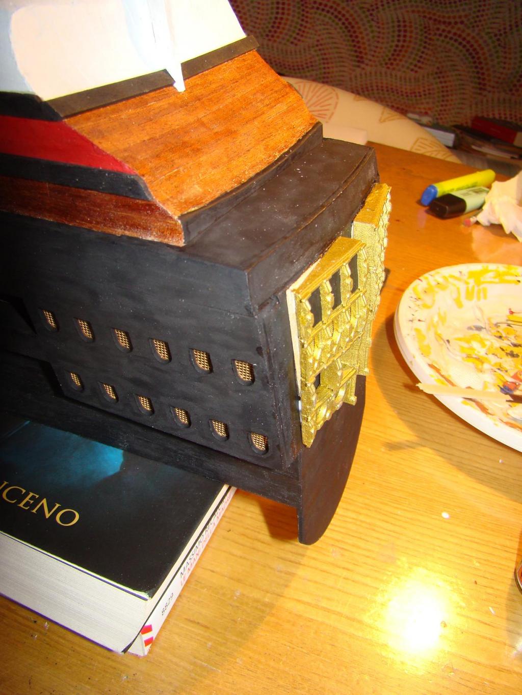 Ho preso i pezzi metallici e li ho rifiniti con una lima per eliminare i residui dello stampaggio (foto 2). Con un pennello ho passato una mano di vernice color oro X12 della Tamiya su questi pezzi e a vernice asciugata ho eseguito una prova di montaggio (foto 3). Vedendo che i pezzi si incastravano perfettamente li ho fissati allo specchio di poppa con colla cianoacrilica (foto 4). Il passo successivo è stato quello di realizzare un cannone e di legare dei bozzelli col filo di alluminio. Non sto qui a descrivere questi passaggi avendoli già ampiamente descritti nelle uscite precedenti. Il risultato lo vedete nella foto 5. I 2 bozzelli con legatura in alluminio ad 1 occhiello sono stati attaccati al cannone mentre quelli con legatura a 2 occhielli sono stati messi via in attesa di futuro montaggio.
