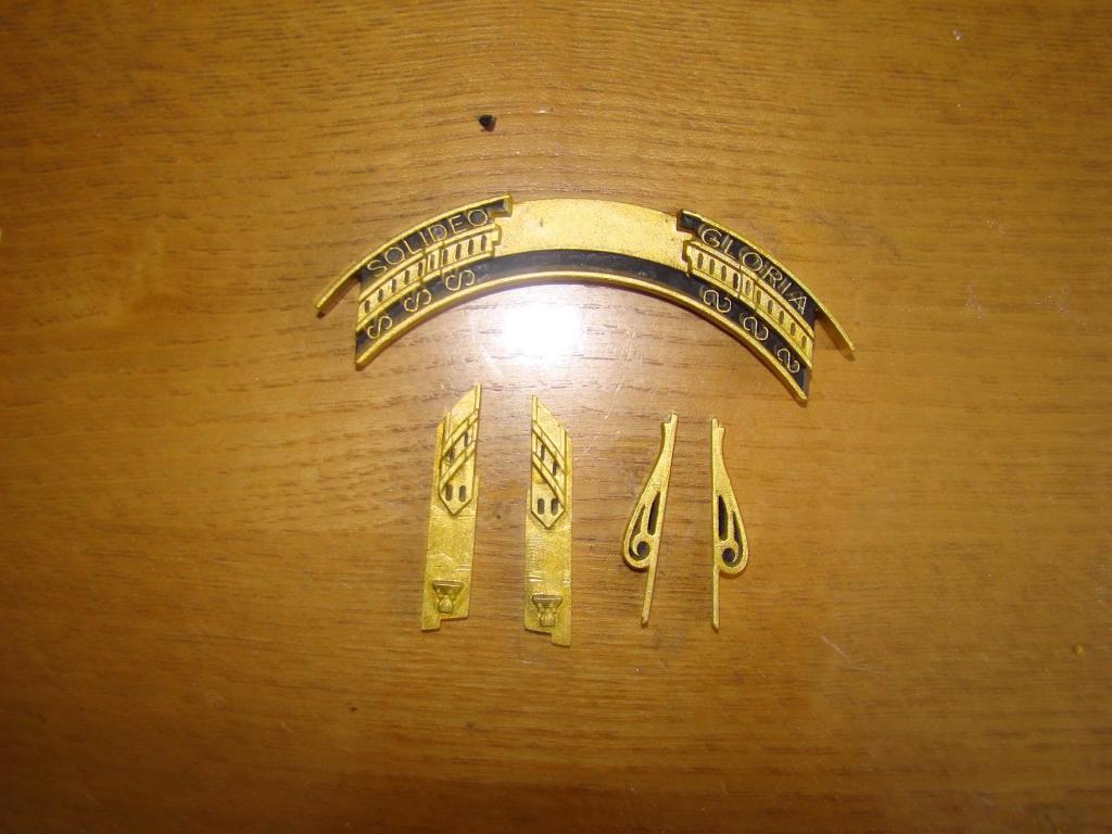 Ho colorato di nero lo specchio di poppa e la parte esterna delle bottiglie (foto 1 e 2). Particolare attenzione va posta nel colorare i bordi delle finestre per non macchiare di nero la griglia metallica. Ho preso il listello di compensato contenuto nell'uscita 49 (foto 3) e l'ho fissato in posizione centrale sullo specchio di poppa (foto 4). Come vedete dalla foto il pezzo è stato fissato con del nastro di carta e non con la colla perchè una volta esaurito il suo compito verrà tolto. Ho iniziato a incollare i pezzi metallici sullo specchio di poppa partendo dal basso (foto 5). I primi pezzi che ho incollato, usando colla cianoacrilica, sono stati quelli preparati nell'uscita 49 (foto 6). A questo punto avrei dovuto proseguire coi pezzi contenuti in questo fascicolo ma andando a fare delle prove di montaggio mi sono reso conto che gli incastri tra i pezzi non tornavano bene e che l'insieme di tutti i pezzi metallici non era bene a contatto con lo specchio di poppa. Ho provato a piegarne alcuni ma in generali sono pezzi molto spessi che non è facile piegare e ho preso la decisione di procedere con un diverso metodo. Ho staccato dallo specchio i pezzi che avevo incollato e ho eseguito il montaggio delle 2 parti dello specchio sul tavolo (foto 7), unendo i pezzi con colla cianoacrilica. Successivamente ho incollato le 2 parti realizzate allo specchio (foto 8). Così facendo son sicuro che l'unione dei pezzi tra di loro è stata eseguita nel migliore dei modi ma non ho eliminato lo spazio che mi si veniva a creare in alcuni punti tra i pezzi metallici e lo specchio di poppa. Per eliminare questo inconveniente ho deciso di riempire questo spazio con dei pezzi di legno sagomati alla giusta misura (foto 9) e incollati con colla vinilica. A colla secca sono andato a colorare di oro questi pezzi mascherandoli coi pezzi metallici (foto 10).