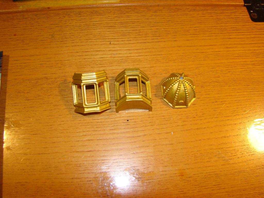 Sulla cima di questi pezzi ho incollato il cilindro 83 precedentemente staccato dalla fustella e rifinito con la lima (foto 1) e sopra il cilindro l'anello di legno 84 (foto 2), incollaggi eseguiti con colla vinilica. Poi ho preso l'elemento decorativo metallico dall'uscita 48 (foto 3) e con una goccia di colla cianoacrilica l'ho incollato sopra l'insieme di questi pezzi, inserendo la base dell'elemento nell'anello di legno (foto 4). Questo insieme di pezzi è stato poi incollato con colla vinilica all'insieme di pezzi realizzato nell'uscita 49 (foto 5) e che costituirà il tettuccio della chiesuola. Questo tettuccio è stato poi verniciato di oro nella parte alta (foto 6) e di marrone scuro in quella bassa. Quando le vernici si sono seccate ho incollato con colla cianoacrilica la campana ricevuta col fascicolo 48 proprio al centro della parte bassa (foto 7). Per ultima cosa ho attaccato il tettuccio alla base della chiesuola sempre con colla vinilica (foto 8).