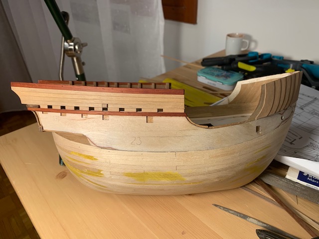 I lavori sono andati ancora un po' avanti. Terminata la murata, al grezzo: dovrà essere completato l'incintone (sono indeciso tra il nero oppure un ulteriore rosso), dovranno essere aggiunti i parabordi (rossi), qualche ombrinale e magari le pulegge per le scotte, andranno fatti gli occhi di cubia e le aperture per il bittone di prua, poi dovranno essere rifilati i travetti che fuoriescono. Procederò comunque ora col fasciame.