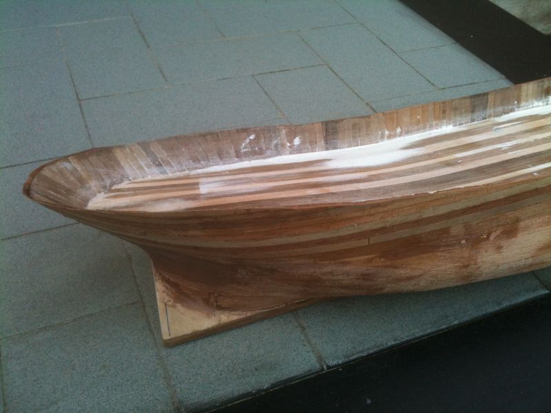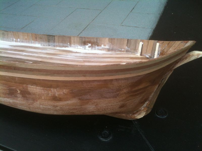 3) ho raccordato questa parte curva con gli altri listelli che fasciavano lo scafo , ottenendo un fasciame abbastanza omogeneo , con la parte poppiera costruita a sè stante ed unita con colla vinilica al resto del fasciame . Il secondo fasciame ed il fasciame interno longitudinale contribuiscono a creare uno scafo solido che unisce discretamente la poppa tonda con le fiancate dritte .