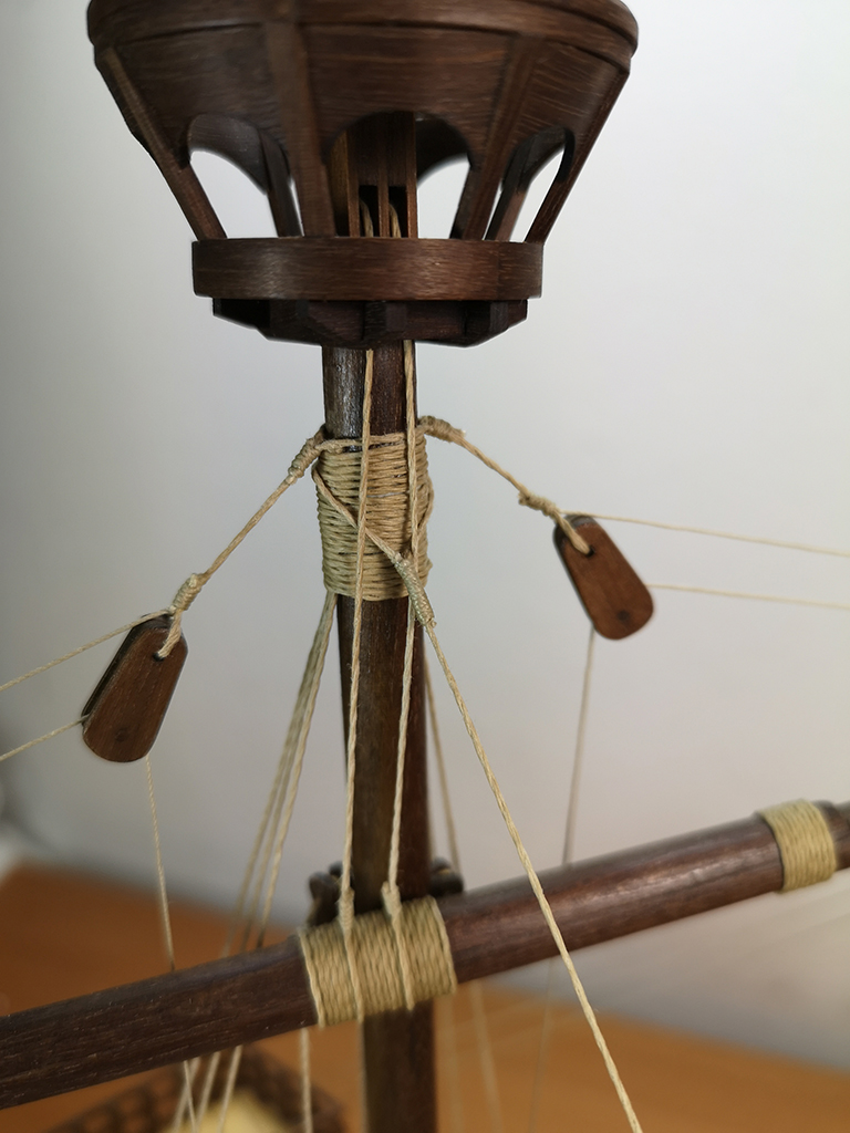 Riguardo alle sartie il disegno numero 8, che convince anche me, pare suggerire qualcosa: le cime superiori formano infatti un cerchio attorno all'albero di sezione più piccola rispetto a quelle che seguono, a scendere. Ciò potrebbe essere una indicazione che le sartie danno di volta intorno all'albero (incappellandosi), poi vengono serrate ad esso con altri giri di cima. Una soluzione del genere sarebbe piuttosto robusta e semplice, impedendo lo sfilamento delle sartie verso il basso. Riguardo invece all'ancoraggio inferiore, in altra nave più o meno coeva che sto facendo ed ahimè è ferma da tempo immemore (cocca/caracca anseatica) la soluzione per le sartie degli alberi di mezzana e trinchetto è quella di usare robusti anelli collocati in prossimità della murata e che trovano fissaggio ai bagli. Non vorrei che la presenza di anelli alle murate sia una semplificazione realizzativa e che nella realtà gli ancoraggi fossero realizzati a baglio e portati più in alto tramite catene (con anello in testa) sporgenti dalle serrette. Il serraggio al travetto mi pare irrealistico. Trink |