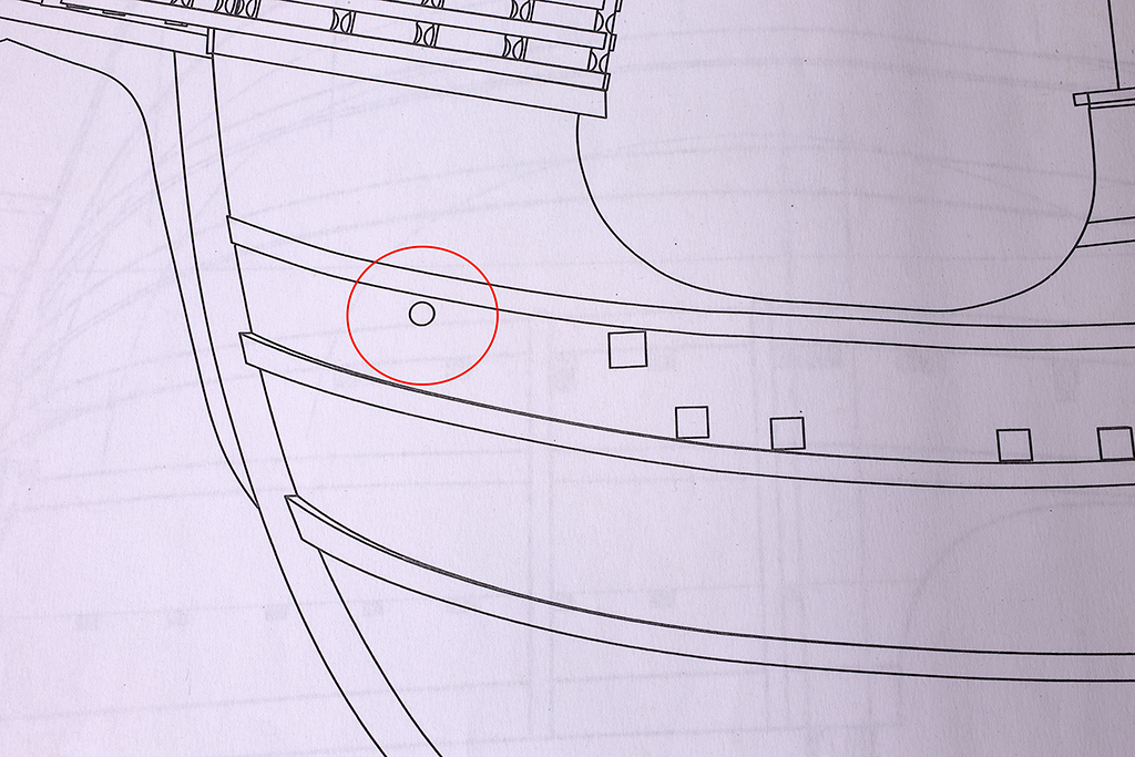 Anche in questo caso, per trovare la giusta sede, ho utilizzato le fotocopie ingrandite dei piani di Winter ed ho riportato queste sui fogli di compensato pretagliato forniti nel kit e che costituiscono le murate esterne della Coca. Da questa sovrapposizione, ho ricavato la giusta posizione e dimensione dei nuovi occhi di cubia del modello. In verde sono evidenziati gli occhi di cubia previsti dal kit Amati.