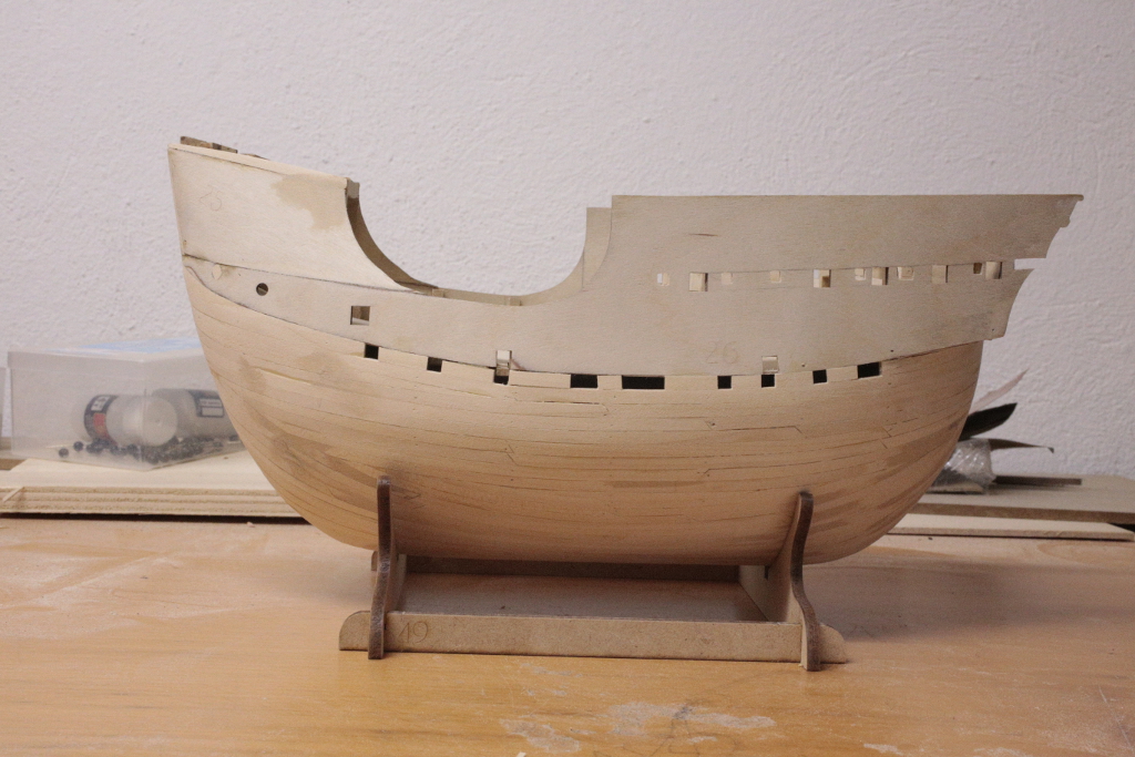 Dopo aver completato la posa del fasciame, ho levigato il modello con carta vetrata ed una buona dose di olio di gomito. Le fessure rimaste sono state stuccate con una "pasta di legno" commerciale e, dopo che questa si è essiccata, lo scafo è stato successivamente levigato con carta vetrata a grana fine.