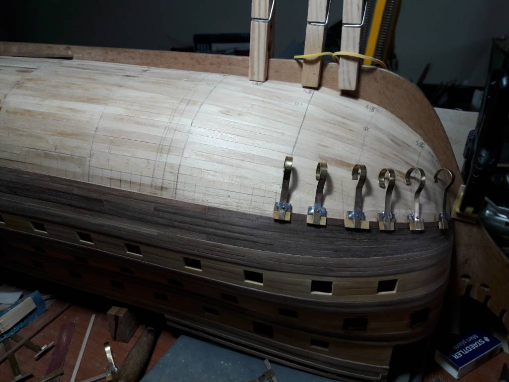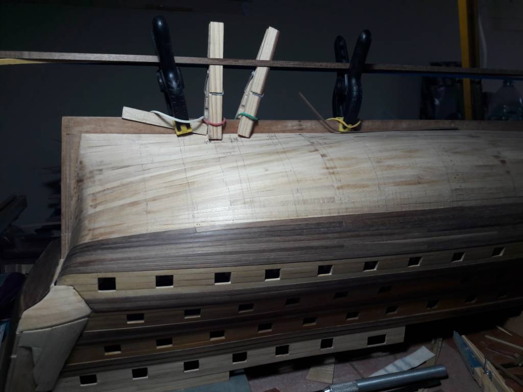 Buonsegatura tutti. Dalle ultime foto ho messo altri tre listelli, non sono riuscito a metterli tutti interi chi era corto chi lungo e chi si spezzava nella curva di poppa quindi gioco forza ho optato per la sezionatura simulando le ordinate del sistema inglese "room and space " cioè intervallo uguale allo spessore dell'ordinata, ho seguito il passo 1a4 sia per i listelli che per le costole , farò una foto intera per mostrare l'effetto ciao buonanotte
