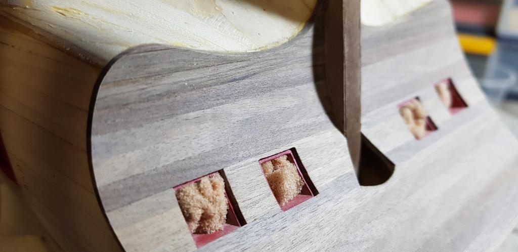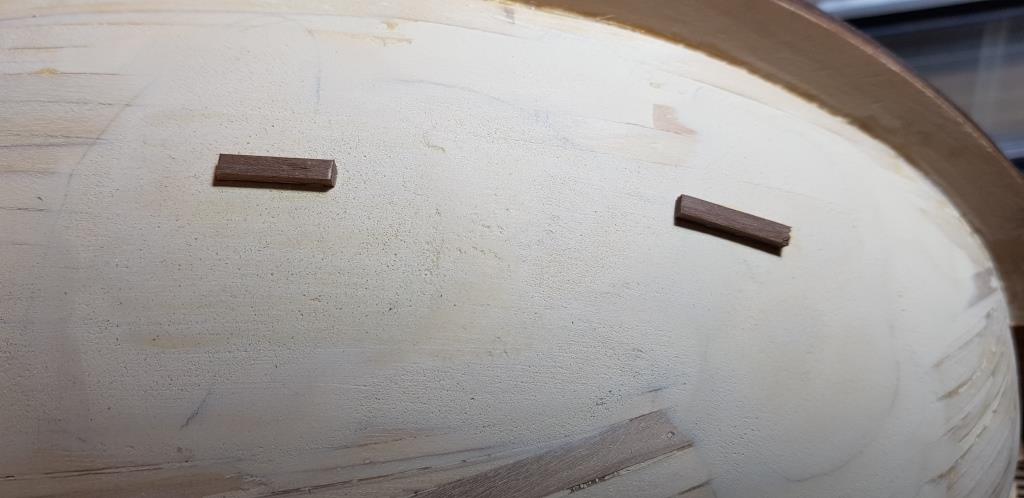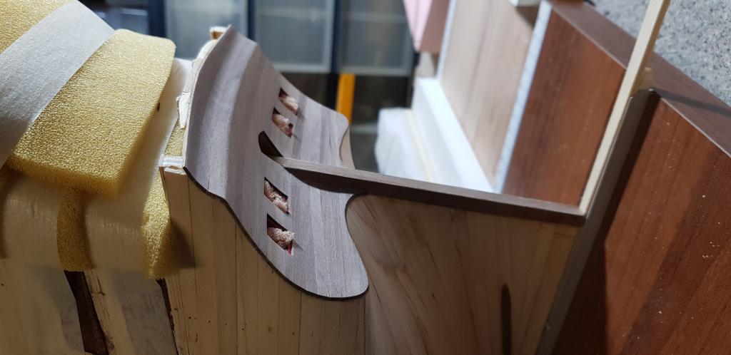 Avevo deciso di rivestire lo specchio di poppa prima del 2° fasciame dello scafo perchè mi risulta che dalla poppa si debba vedere il terminale dei listelli dello scafo. Dove sbaglio ?