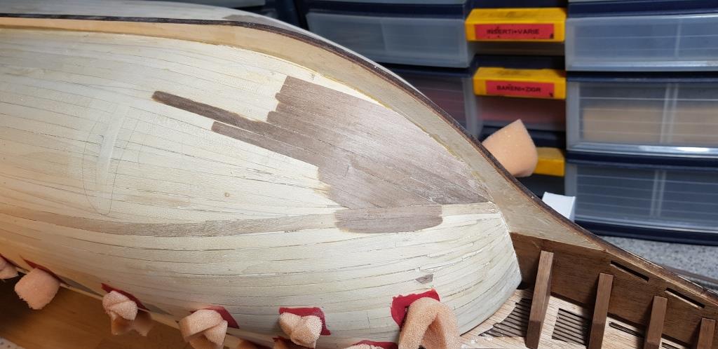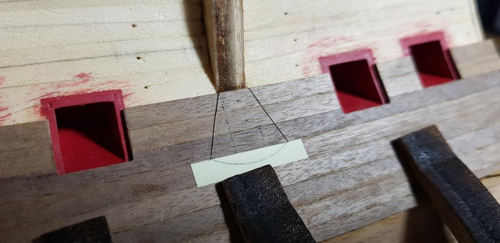 Contrariamente a quanto scritto prima anche la poppa sarà rivestita con listelli di 1 x 4mm altrimenti mi falsa le batture dei portelli dei sabordi che devono essere identiche a quelli sui fianchi dello scafo.