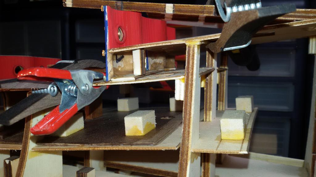 Mantenuto fermo il treppiede, ho spostato il modello sul tavolo a destra e sinistra fino a che il raggio non coincideva con il supporto delle canne, a quel punto seguendo la traccia laser sullo scafo, ho passato il lapis sulla traccia.