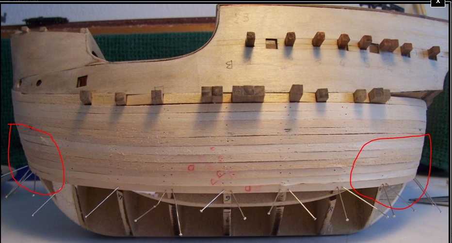 Ma non si nota alcuna rastrematura dei listelli, mentre quelli segnati in rosso dovevano essere ridotti almeno alla metà sia a prua che a poppa. Ora con uno scafo così "bombato" sarà difficile proseguire con lo stesso numero di listelli su ogni ordinata.