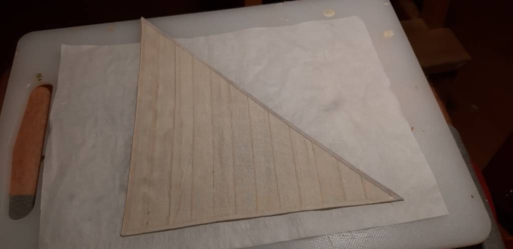 Ecco il lenzuolino completo che tagliato in diagonale mi darà le due vele, la parte più macchiata andrà sul modello cavia, quella migliore sull'altra.