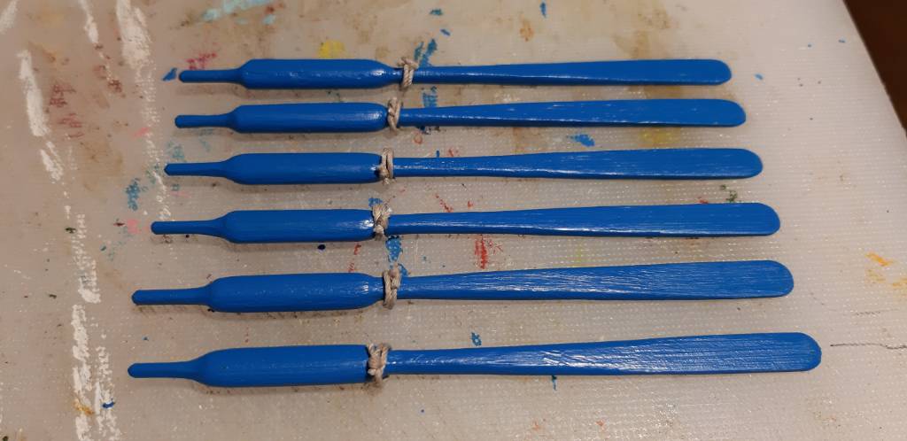 Qui sotto tutti gli otto remi in vari stadi di lavorazione. So o tutti ricavati da bastoncini di bambù del cinese.